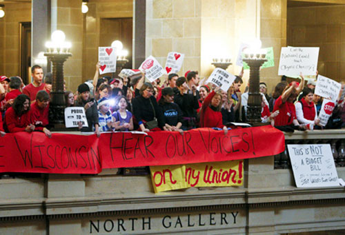 The atmosphere in Wisconsin remains electric. Workers and youth from every region of the state and beyond and from all sectors of the economy have come together determined to defend their rights and the rights of all. They are resolute and convinced that only their staunch opposition can stop the growing state-organized attacks in the United States and specifically the blatant state-organized attack on workers’ rights unleashed by Governor Scott Walker. February 22, rumors swirled that Walker was preparing to use force to remove protestors from the state capitol building in Madison. Immediately, 200 steelworkers organized themselves to march into the building and spend the night and defend the protest. They joined teachers from their various locals and unions, who along with firefighters are the main force. In large numbers as well are state public sector workers of the American Federation of State, County and Municipal Employees, industrial workers from various plants, machinists, meatpackers, teamsters and others. Also present are representatives of national minorities who see in this attack on union and workers’ rights an attack on their rights as human beings. Prominent in their numbers, exuberance and discipline are the youth of Wisconsin. Many schools across Madison, Milwaukee and elsewhere in the state closed as teachers and students alike protest the assault on the right to organize into unions, which from their collective strength can bargain for wages, benefits, pensions and working conditions commensurate with the work performed.